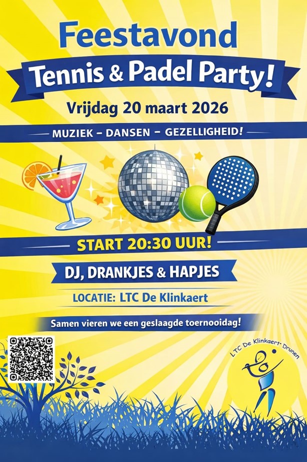 20 maart organiseert het DDOT een gezellige Tennis en Padel Party in ons clubhuis. Vanaf 20.30 uur gaat het los met een DJ, een hapje en een drankje.
